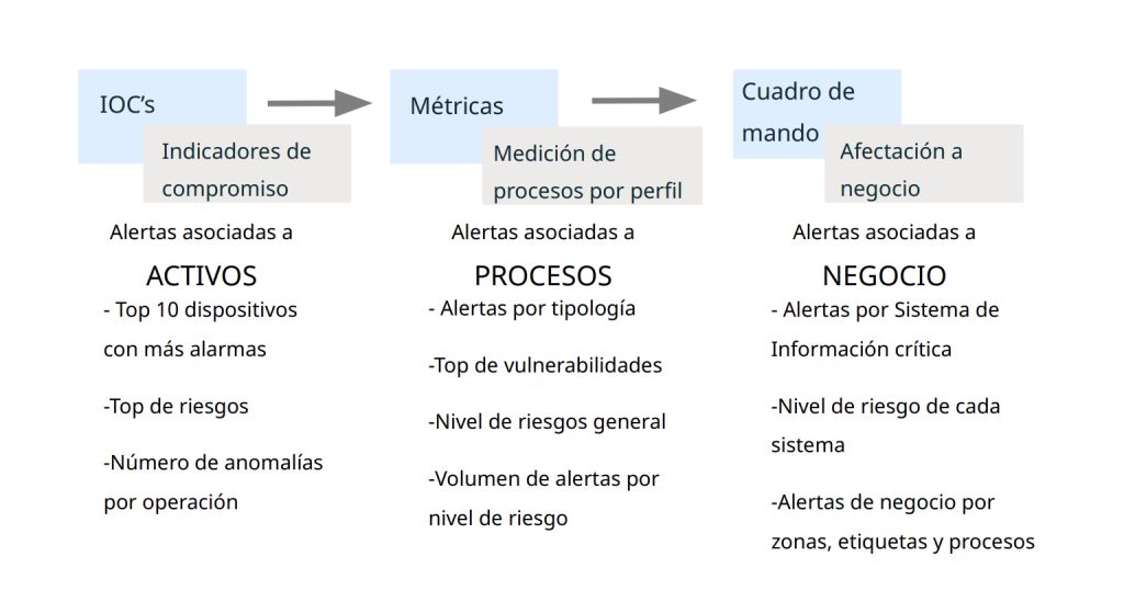 El cuadro de mando permite ver las alertas, riesgos y anomalías agrupadas por Activo de negocio, pero también por servicios de alto nivel o por Negocio directamente, de modo que tengamos una foto completa de nuestro entorno de operaciones, y cada responsable pueda tener su propio cuadro de mando.